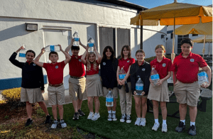 At St. Mary Academy in Sarasota, Julie Drapper’s 7th grade class used the book, “A Long Walk to Water” by Linda Sue Park, which was explored in depth. In the book, Nya and Salva must work to survive daily challenges as 10-year-olds during wartime where no clean water is readily available. In this experience, the students analyzed their own walking with a jug of water and compared and contrasted the experiences Salva and Sya had to work through each new day. Keeping in mind their creativity and problem-solving skills, the goal of the students was to think like Nya and Salva about what skills helped Mya and Salva the most and why. The students also learned about the water crisis in our world. Including facts, such as 1 out of 9 people (783 million) worldwide do not have access to safe and clean drinking water. Or, in developing countries, nearly 80% of illnesses are linked to poor water conditions meaning better water sanitation and hygiene could prevent the deaths of close to 300,000 children per year. The reality is that every day, millions of people walk miles a day to get water for their families. To represent what it feels like to carry water for a specified distance, the students walked a lap around the field, carrying one-gallon jug of water weighing 8.34 pounds. To help add a greater immediacy to the project, the class was in regular contact with a missionary (a teacher from St. Mary Academy) who was doing work in Uganda and offering real life examples of people in need.