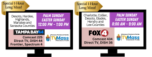 The Televised Mass for the Homebound on Palm Sunday (March 29, 2026), and Easter Sunday (April 5 and celebrated by Bishop Frank J. Dewane), will air for a full hour on both Sundays. Because of the length, the time of the broadcast on these two Sunday will air at a special time. For viewers in the northern portions of the Diocese (DeSoto, Hardee, Highlands, Manatee, and Sarasota counties), the Masses will air at 10:30 a.m. on the CW Network. In the southern portions of the Diocese (Charlotte, Collier, Glades, Hendry, Lee counties), the Masses will air at 8 a.m. on WFTX-TV (FOX-4). Please check your cable provider for channel listings. The televised Mass is also always available online at dioceseofvenice.org or on YouTube. Visit dioceseofvenice.org/tv for more information or contact Rachel Powers at powers@dioceseofvenice.org.