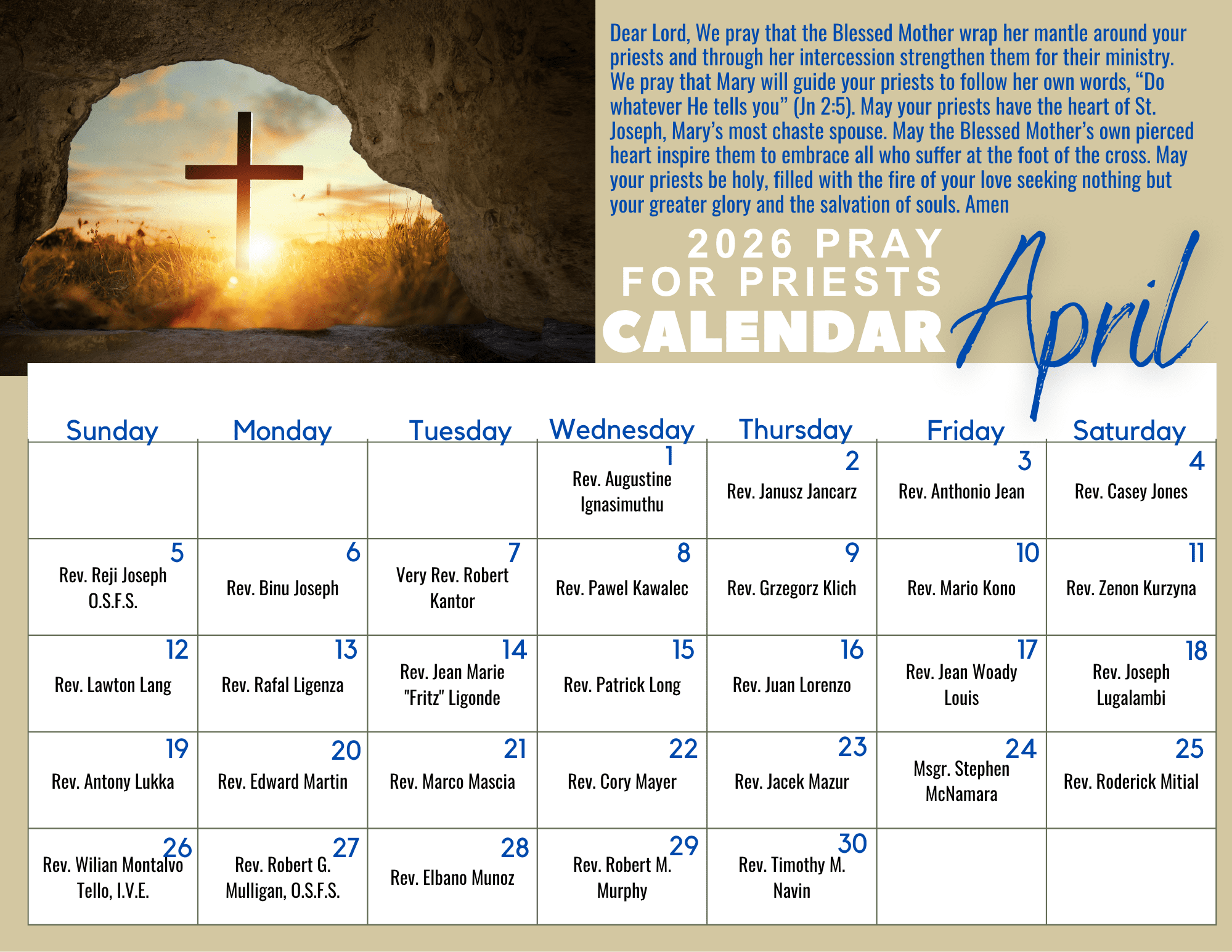 To download the Pray for a Priest calendar, click on the link: April 2026 – Pray for Priest Calendar